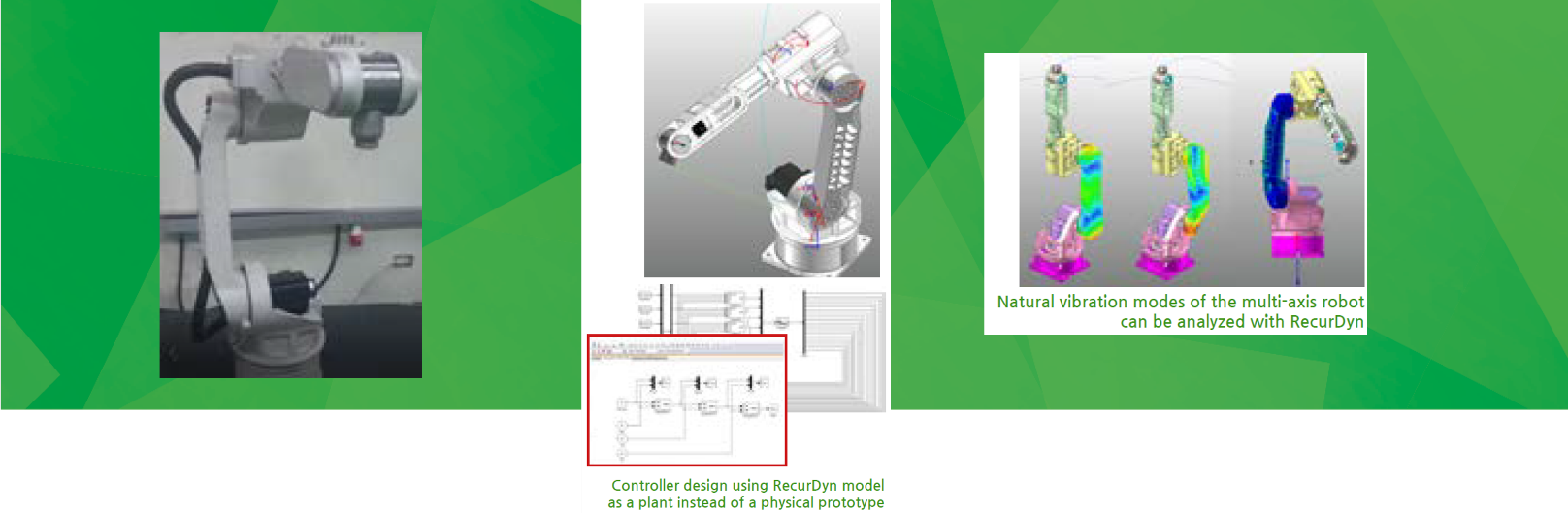 运动控制器、部件的刚度、工作过程的振动及驱动电机的惯性比等均是工业机器人研发过程需要考虑的重要内容。如果机器人单纯采用试错法或经验设计,那么只有在原型完成后才能发现设计问题,相应地,会导致开发周期长、产品质量低。在制作实物原型前先通过仿真手段对设计进行评估验证,可显著降低开发成本。成立于1973年的ITRI工业技术研究院,在开发关节机器人时借助RecurDyn仿真验证机器人及其控制器的性能,从而确保了控制器和机器人各元件(如电机、轴承和减速器)的有效设计。而且,ITRI利用RecurDyn柔性体建模仿真技术快速高效地执行各种姿态的振动分析,大大节约开发成本。