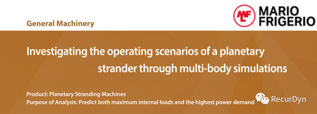 行星绞合机是单工序或多工序生产钢绞线和钢丝绳的大型机器,多个绞合单元同时共绕一轴进行扭转,绞合元件最初缠绕在卷轴上,卷轴安装在旋转的保持架上,因绞合机工作条件特殊,设计过程不得不考虑其特殊的移动质量和结构故障可能引发的风险。意大利Mario Frigerio S.p.A.是绞合机的领先制造商,该公司开发定制的行星绞合机须满足特殊的规格要求,在设计过程中采用RecurDyn软件对绞合机所有可能面临的操作场景进行了仿真分析,依据仿真结果确定了最大负载、零件尺寸以及大型电机的规格。