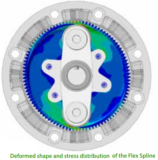 应变波齿轮传动又称谐波齿轮传动,能在小而轻的结构中实现很高的减速比,具有零背隙、高扭矩、高精度、高可靠性等特点,广泛应用在诸如机器人、航天航空、医疗器械、铣床、生产设备等紧凑型高精度产品领域。柔性齿轮(柔轮)在快速旋转物体(波形发生器)作用下变形为椭圆形,其轮齿与刚性内齿轮(刚轮)啮合。传统的有限元分析(FEA)软件难以仿真这种齿轮快速变形、齿轮接触与显著惯性力耦合的复杂行为,该案例采用RecurDyn MFBD(多柔体动力学)技术对这一复杂系统的性能进行虚拟预测。