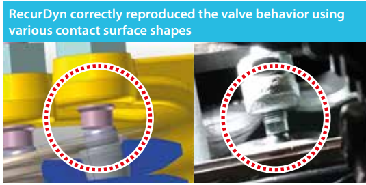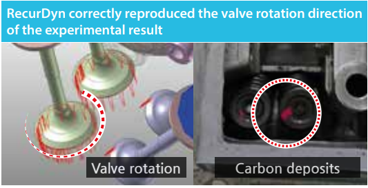A scooter manufacturer desires to reduce engine failure by reducing carbon deposits around the inlet ports. The inlet valves are designed to be rotated by the camshaft movement when they are opened to prevent the buildup of carbon. At high rpm, the valves rotate well. However, at low rpm, the valves do not rotate adequately to prevent carbon build-up. As a result, under low rpm use, there can be significant carbon deposits around the inlet ports, which can lead to engine failure. RecurDyn was used to identify that valve contact surface shape is the key to trigger valve rotation. Then RecurDyn was used to design and validate a different, improved valve contact surface shape that can enable sufficient valve rotation even at low rpm to prevent carbon deposits from forming.