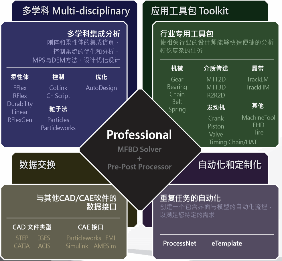 以RecurDyn Professional为基础,可实现RecurDyn与其它软件协同的多学科仿真。