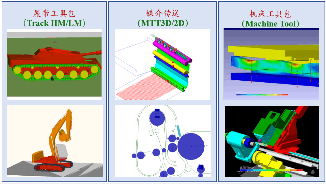 RecurDyn提供分种类丰富的行业工具包,用于多领域应用的快速建模、高效求解。基于RecurDyn多领域的行业工具包,可以方便地实现履带、机床、发动机、皮带滑轮、齿轮、链条、轴承、弹簧等系统的数字化样机建模仿真。