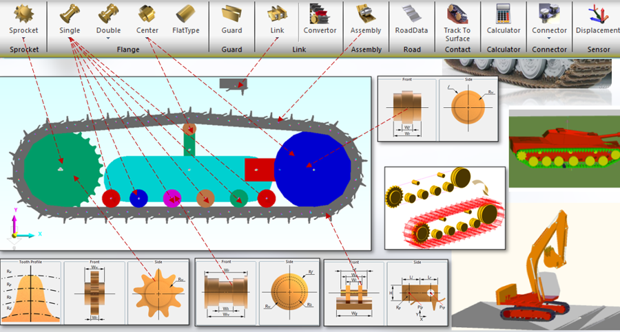 专为坦克装甲等车辆设计的专业化高机动履带系统工具包,丰富的履带系统组件,可参数化地调节各部件的几何形状。工具箱由链齿轮,路面车轮,履带链接,橡胶衬套和地面剖面库等组成。利用这些部件,可以迅速建立履带车辆,分析诸如履带链接和地面之间的接触特性。同时亦可由稳健的积分器求解驾驶中的强烈摆动问题。