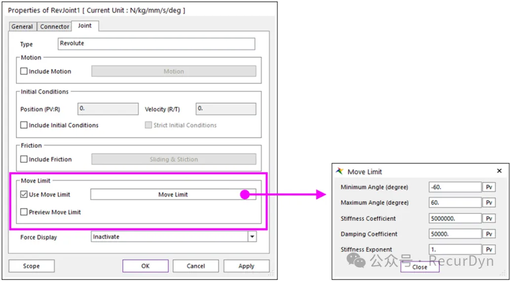 对于转动副Revolute、平动副Translate及圆柱副Cylindrical,通过Move Limit option 选项设置具体参数可限制其运动范围,当运动副的运动企图超越所定义的范围终点时,在运动副上施加力限制其继续运动。Move Limit option通过输入必要的参数来定义运动区间(角度、位置)和限制力。