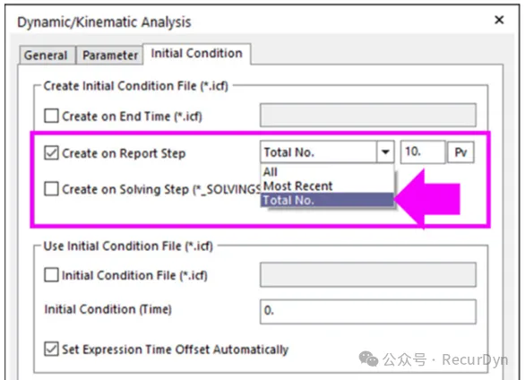 在Dynamic/Kinematic Analysis 对话框的Initial Condition页面新增按照用户指定的时间间隔创建*.icf文件的选项。