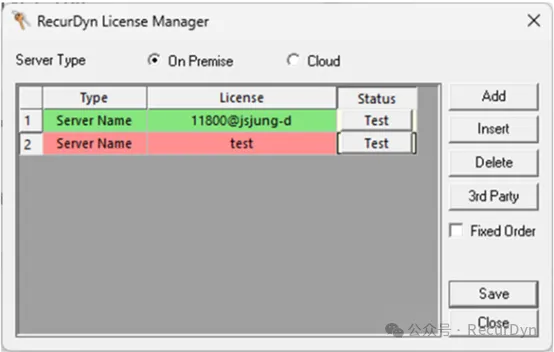新增测试许可证服务是否正常运行的功能,通过单击RecurDyn License Manager对话框的Test按钮来验证服务的有效性:绿色显示表示有效,红色显示表示无效,无效时弹出错误消息对话框。