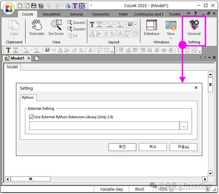 除了内置的Python之外,RecurDyn2025还可以使用用户安装的Python包。通过 [CoLink tab > Setting group]指定Python的安装路径。(Use External Python Extension Library (Only 3.9) )