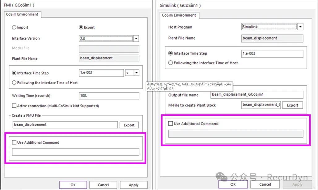 Simulink模式及FMI模式的联合仿真支持批处理命令,当RecurDyn作为从程序时,允许输入各种RecurDyn批处理命令,如/RDP、/OUT和/Show。在执行联合仿真前,可以使用/RDP命令更新RecurDyn模型的参数点和参数值。