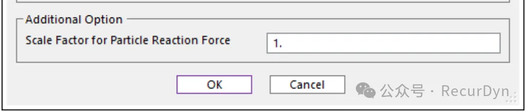 在[External SPI tab > Particleworks group]设置对话框新增 ‘Scale Factor for Particle Reaction Force’选项,用于缩放流体粒子施加在RecurDyn Body上力的大小,无需修改Particleworks模型,可通过缩放流体力方便地实现高压流体对系统产生影响的联合仿真。