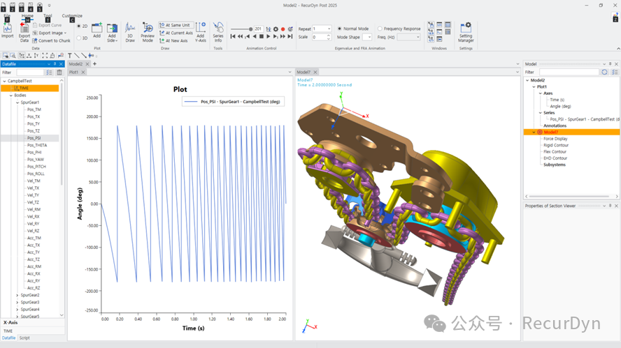 支持确认齿轮对的啮合刚度,之前版本中必须通过KISSsoft界面来一次查看一步的啮合刚度,在RecurDyn2025中通过[DriveTrain tab > KISSsoft group > Post button]可查看每一步啮合刚度的变化。