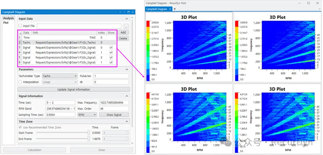 在Acoustics Scope对话框中增加‘Generated RPLT for Whole Data‘ 选项,允许通过曲线查看完整结果,结果文件夹中的*.rplt文件和*.fplt文件包含了完整Acoustics数据,可通过RecurDyn后处理进行查看*.rplt和*.fplt文件。