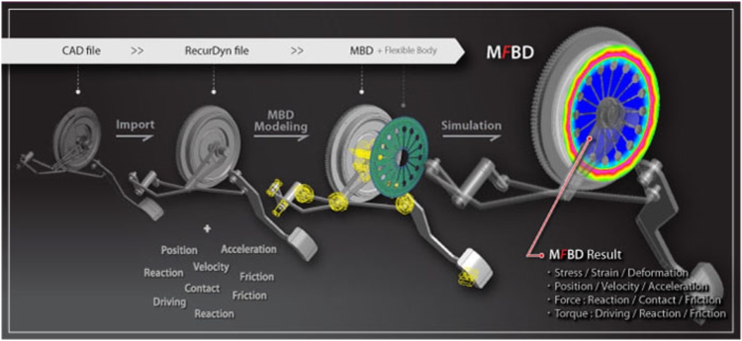 MFBD(Multi Flexible Body Dynamics)技术将有限元方法(FEM)和多刚体动力学(MBD)算法相结合,以有限元方法描述多体系统中一个或多个柔性体机构的行为。刚体与柔性体机构在同一个系统中进行求解计算,保障了系统运行中因几何变形和弹-塑性变形所引起的机械系统运动行为的真实结果。